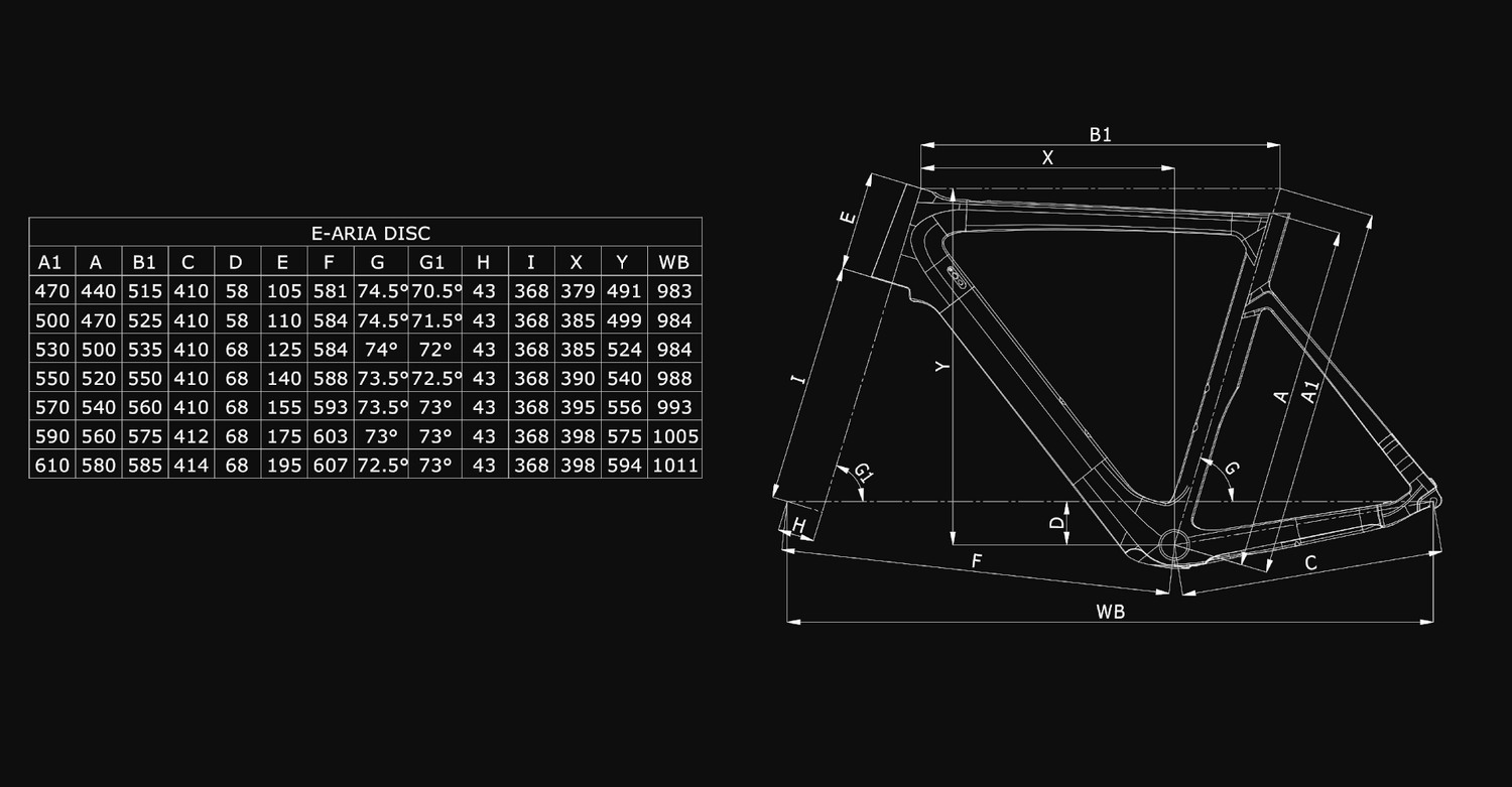 Aria E-Road carbonio, compatibile trasmissioni meccaniche/elettroniche, mov. centrale PressFit 86,5x41mm, serie sterzo 1.1/4"-1.1/8", collarino reggisella integrato, forcellini full carbon, flat mount, QR system, OLD 135mm